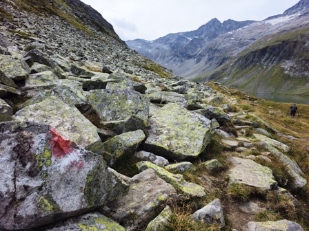Dann begann ein Steig, der es nicht besonders freundlich mit uns meinte: Große Steine und Platten, teilweise hohe Tritte und zeitweise rutschiger Untergrund. Er hatte aber einen Vorteil: Er lag morgens und später auf dem Rückweg im Schatten. Bei so einer steilen Strecke ist man dafür schon dankbar. Nach diesem Steilstück, so versprach uns Moni, käme ein relativ flaches Weidegebiet, und danach würde es zwar wieder ansteigen, aber nicht mehr ganz so steil